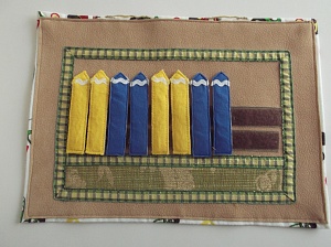 Описание странички: на игровом поле пришиты островки контактной ленты для прикрепления рукавичек. С правой стороны игрового поля расположена этажерка с четырьмя полочками для прикрепления парных рукавичек.