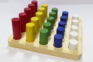 Предлагаем ребёнку расставить цилиндры в подставке и сгруппировать для этого все фигуры по 2-м основным признакам – цвету и высоте. С помощью этого пособия ребёнок учится различать и называть основные цвета, осваивает понятия высокий, низкий, выше, ниже, одинаковые по высоте.
