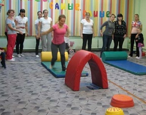 Давайте превратим спортзал в весёлый стадион. Сегодня в наших соревнованиях участвуют воспитатели и мамы, а дети будут болельщиками. Командам приготовиться к приветствию. Воспитатели: команда «Улыбка». (Звучит фонограмма песни «Воспитатель».) Родители: команда «Дружба». (Звучит фонограмма песни «Родители».)