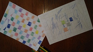 Берём лист формата А4, пластилин и цветные карандаши. Превратим лист в цветную клеёнку под горячее. Для этого просто линуем лист вертикально и горизонтально, образуя крупные клетки. Закрашиваем их цветными карандашами по своему усмотрению. Теперь берём листы цветной бумаги и вырезаем столовые приборы – вилку и нож. Затем берём белый лист и вырезаем круг – будущую тарелку. По желанию можно раскрасить окантовку тарелки цветными карандашами. Либо можно вырезать цветную тарелку – в данном случае цвет не важен. Из этой же белой бумаги вырезаем нечто, похожее на растёкшуюся по сковородке яичницу. На заготовке рисуем круг, по которому размазываем желтый пластилин.