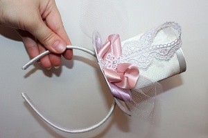 Этап 7. Закрепляем шляпку на ободок. Наклеиваем на ободок двусторонний скотч, для того что бы лента хорошо держалась и не соскальзывала, приступаем к обматыванию ободка.