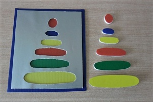 Описание и характеристика дидактической игры: игра представляет собой лист картона с прорезями для вкладывания овалов разной величины; овалы соответствуют прорезям по размеру и цвету.