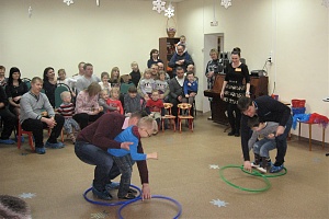 Ведущий: Видите, какие у нас папы! Даже с двойняшками на руках не сдаются! Победила дружба! Мы с вами переходим к следующему заданию. Военные должны быть не только сильными, смелыми, но и умелыми. Спортивная игра «Переправа». Все делятся на пары: ребёнок и кто-то из родителей. Каждая пара участников с помощью обруча перебирается до грибочка с одного берега на другой. Побеждает пара, которая быстрее доберётся обратно.