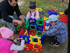 Лунтик: Ребята, я хочу вам показать свою страну Леголенд. Но она находится очень далеко! Давайте мы с вами построим Легострану прямо здесь, у вас на участке? Но вот вопрос – как называется профессия, которая конструирует роботов? (Ответы детей.) Правильно, инженер-конструктор. Кри-бле-кра-бле-бумс! Я превращаю вас и ваших родителей в конструкторов. (Музыкальное сопровождение: Верес «Волшебство (превращение)», песенка Фиксиков «Помогатор».)