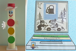Материалы к игре: цветные картонные кружки — красный, жёлтый, зелёный; игровая модель светофора; макет «Дорога», маленькие машинки для обыгрывания, карточки с правильным и неправильным поведением детей (ситуациями) на дороге, на улице и в транспорте.
