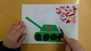 Шаг 7. Дети наклеивают подготовленную воспитателем звёздочку по середине башни танка.