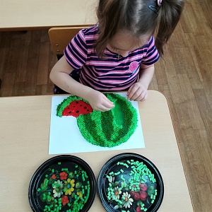 Поделка «Арбуз» стала результатом коллективного творчества. Для неё были предложены трубочки светло-зелёного цвета длиной 9 мм, тёмно-зелёного цвета длиной 7 мм и красного цвета длиной 5 мм. Это позволило наиболее точно передать внешний вид арбуза. Когда поделка была готова, дети отметили её необычность из-за получившегося эффекта объёма, известного современным дошкольникам как «3D эффект».