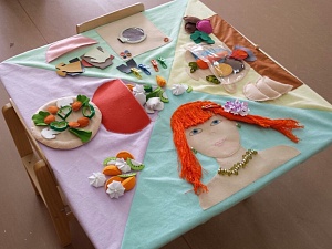 Сектор «Кухонный стол». На скатерти пришита тарелочка в виде большого кармана, в который можно сложить съёмные фетровые детали: овощи, фрукты, грибы. Есть отдельный круг, который можно использовать как основу пирога, пиццы или как обычную тарелку. Ребёнку предлагается приготовить сладкий пирог. Малыш выбирает из продуктов те, которые необходимы: апельсины, киви, крем. Если готовим пиццу, ребёнок выбирает колбасу, грибы, листья салата, перец. Игра расширяет представления детей о видах блюд, учит сравнивать, выбирать по одному или нескольким признакам. В этой же игре ребёнка можно познакомить с сервировкой, закрепить в игре правила поведения за столом.