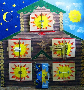 Очень долго я вынашивала идею, как бы оформить домик с замочками красиво. В интернете не находила тот вариант, который бы устроил меня и мужа полностью. И тут мой муж подсказал идею теремка. Мы принялись за воплощение идеи: ночами рисовали карандашом, потом гуашью наш теремок. Поэтому главное: сделайте карандашный набросок в миниатюре, а затем, подобрав прочные материалы, приступайте к самому созданию игрушки. Оформление любое, на ваш вкус. Окошки сделали с помощью прозрачных кармашков, которые я взяла из старых мягких фотоальбомов. Вариант приклеивать фотографии близких людей не понравился, так как это ограничивало бы использование домика. Нашлась и чисто мужская работа — нужно было найти и купить разного рода щеколды, замочки, миниатюрные петельки к ним. Хорошенько обработать все деревянные элементы, чтобы они не причинили вред ребёнку.Как мы играем с теремком