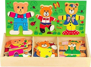 Набор представляет собой деревянный пазл. Игра способствует развитию внимания, памяти, логического мышления, воображения. С его помощью ребёнок сможет одеть маму, папу и медвежонка. Для каждого члена семьи имеется шесть костюмов, здесь и зимняя одежда, и летняя, и пижамы. Каждая фигурка собирается из трёх частей. Удобно собирать их на крышке коробки, где есть специальные углубления. Набор упакован в деревянную коробку, внутри которой есть отделения для одежды каждого из медведей. Все детали качественные, очень яркие, гладкие.