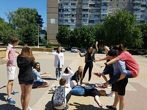 Вам предстоит построить в лагере целый город со своими районами и инфраструктурой. Посмотрим, справитесь ли вы со строительством хотя бы одного домика! Встаньте так, как вам будет удобно строить дом. В доме стены поддерживают крышу, дверь открывается для гостей, окна смотрят на улицу, в доме много уютных и необходимых вещей. Вы уже догадались, что строительные материалы мы вам не вынесем? Вы сами будете основой вашего общего дома. Приступайте к строительству! У вас примерно 4 минуты. (Звучит музыка. Команды строят дом. Оценка результатов. Ведётся фотосъёмка процесса.)