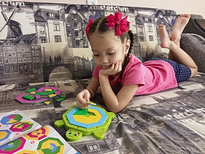 Пока я разбиралась с правилами, Ульяна интуитивно начала играть с черепашкой и с первого раза собрала разноцветный панцирь из самых крупных деталей. Вскоре я предложила ей попробовать выполнить одно из заданий первого уровня сложности. Ульяна с радостью согласилась, и мы погрузились в мир логических задач. Часы пролетели незаметно. Мы смеялись, обсуждали, какие цвета лучше подходят друг к другу, и искали самые интересные комбинации. Вскоре к нам присоединилась и младшая дочка, которой тогда было всего два года. Она с любопытством наблюдала за старшей сестрой, а затем тоже захотела поиграть. Игра увлекла всех - от мала до велика! Младшая, конечно, пока только пыталась примерить детали на черепашку, но даже это вызывало у неё бурю восторга! Она просто наслаждаясь процессом.