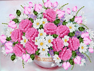 Цветочный букет, вышитый крестиком, на деревянной основе смотрится весьма свежо и необычно. Для такой работы совсем не требуется подрамник, вышивать достаточно просто даже новичкам. Нужно лишь строго следовать имеющейся в комплекте инструкции. А после окончания работы, соедините детали подставки, и теперь ваша картина будет прекрасным украшением интерьера. Цветочная композиция разноцветная, но не пёстрая, оттенки сочетаются друг с другом, оставляя ощущение гармонии.