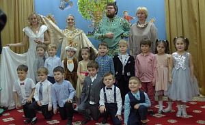 Оформление и оборудование: (на дальнем занавесе) дуб, царь Кащей, ступа с бабой Ягой, избушка на курьих ножках, белочка с орешком, месяц со звёздами, мальчик и девочка в русских костюмах, море из голубой и синей ткани, золотая рыбка; 7 мисочек для сортировки орехов (грецкие, фундук неочищенный, арахис неочищенный и акриловые камушки, как изумруды). Телевизор, музыкальный центр, шкатулка (ларец) для кота с текстом-путаницей из разных сказок. Столик с портретом А.С. Пушкина, три свечи в старинном подсвечнике, она свеча с лампочкой вместо языка пламени, ваза с красными гвоздиками. Музыкальная фото презентация «Пушкин в музыке».