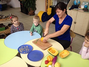 В сентябре ребята вернулись после летних каникул и увидели, что на огороде из неизвестных семечек выросли кабачки и тыквы. Исследование мы продолжили уже с выращенными овощами, в нашем зимнем саду. Дошкольники рассматривали овощи, сравнивали их по цвету, форме, величине, тяжести, гладкости поверхности, пробовали на вкус. Многим детям понравился не только вкус, но и запах тыквы, кабачка. Некоторые дети впервые попробовали их в сыром виде. Дошкольники отмечали, что тыква пахнет дыней, а кабачок - огурцом или свежестью. Все дети очень удивились, когда обнаружили внутри тыквы и кабачка семена. Мы вновь вернулись к семенам! В лаборатории дети рассмотрели семена и мякоть овощей под микроскопом. В семенах они нашли маленький бледный росток, это - новая жизнь.