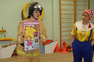 Пожарный: Здравствуйте, ребята! Сегодня мы поговорим с вами об огне. Вы, наверное, все видели огонь костра, огонёк свечи. А знаете ли вы, какую роль играет огонь в жизни человека? (Ответы детей.) Правильно! Сила огня очень велика. Огонь согревает, заставляет работать машины, запускает ракеты, космические корабли. На огне готовят пищу. Но огонь может принести человеку не только пользу, но и вред. Огонь становится смертельно опасным, когда люди забывают об осторожном обращении с ним. Пожар возникает по разным причинам, в том числе и в результате детских шалостей со спичками и другими горящими и огнеопасными предметами. (Слышатся крики, и в зал вбегает Буратино, его нос «горит».)