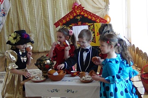 Поудобнее рассаживайтесь, угощайтесь, и с друзьями пообщайтесь! (Садятся за стол, пьют чай под музыку.)