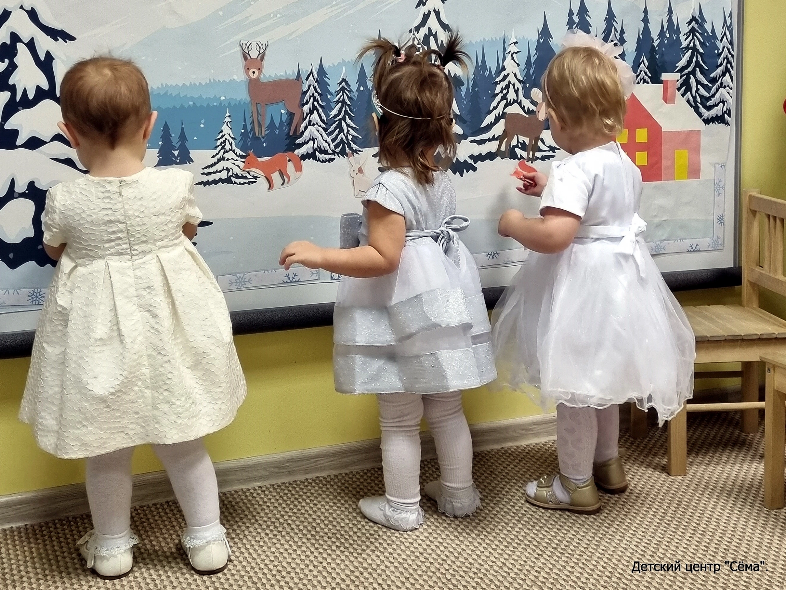 Мышка: Ребята, вот мы в лес и пришли. Смотрите, как здесь много снега. (Снегурочка рассыпает снег.)