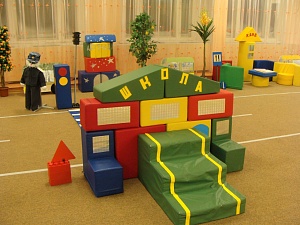 На прогулочной веранде педагогами из мягких модулей был создан микрорайон, включающий в себя дорогу с двусторонним движением, здания, расположенные в нём: детский сад, школа, бассейн, магазин игрушек, кафе, АЗС, поликлиника, музей, кинотеатр и др.