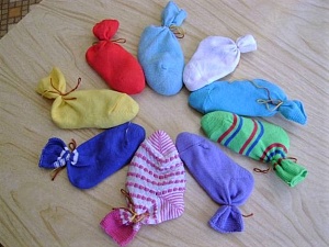 Дети с закрытыми глазами дотрагиваются по очереди до каждого носочка и сочиняют каждый свою историю. Потом психолог перемешивает носочки, и каждый также с закрытыми глазами вспоминает свою историю и раскладывает носочки в прежнем порядке.