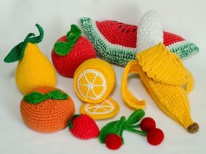 Для ролевой игры хорошо подойдут фрукты-овощи и другая вязаная еда. Такие игрушки учат распознавать цвета, формы и размеры; что относится делить на критерии: фрукты-овощи, сладкое-несладкое и т.п. Вязаные овощи-фрукты можно понарошку «выращивать» на собственном огороде и продавать в магазине, осваивая азы ролевых игр и знакомя с окружающим миром (какие овощи нужны на борщ? из чего лучше сварить компот?).