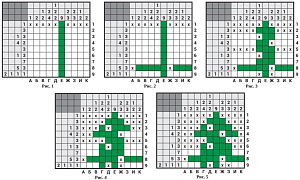 Ну, а дальше – дело техники. Заполняем клетки столбца Ж, отмечаем крестиками пустые поля вокруг клетки Е9 девятой строки, затем заполняем столбец Д и отмечаем пустые поля во второй и пятой строках (Рис. 3). Далее закрашиваем столбец Г и заполняем полностью третью строку. Затем закрашиваем оставшуюся клетку В4 первой группы четвёртой строки и отмечаем пустые поля перед ней (Рис. 4).