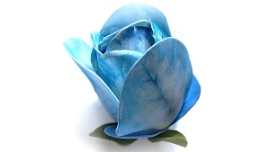 Самый нижний слой лепестков делаем из голубого фоамирана и тонируем прожилки белым акрилом. Для низа вырезаем из зелёного материала «звёздочку» и можно без разогрева, всего лишь пальцами, закрутить листики, материал хорошо помнит форму и можно добиться вполне реалистичного вида.