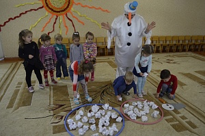 Снеговик: Молодцы, ребята! Получились хорошие снежные комки. Давайте, сделаем Снеговику голову и лицо. (Дети достают из коробки и раскладывают глаза-пуговицы, нос из морковки, волосы из ниток; одевают на голову Снеговика бумажное ведро.).