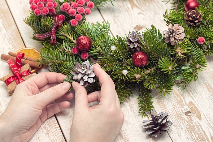 Входные или межкомнатные двери в доме можно украсить новогодним венком из шишек. Для рождественского венка понадобится каркас: проволока, замаскированная в газету. Полученный каркас необходимо обернуть в красивую ткань, например, органзу.