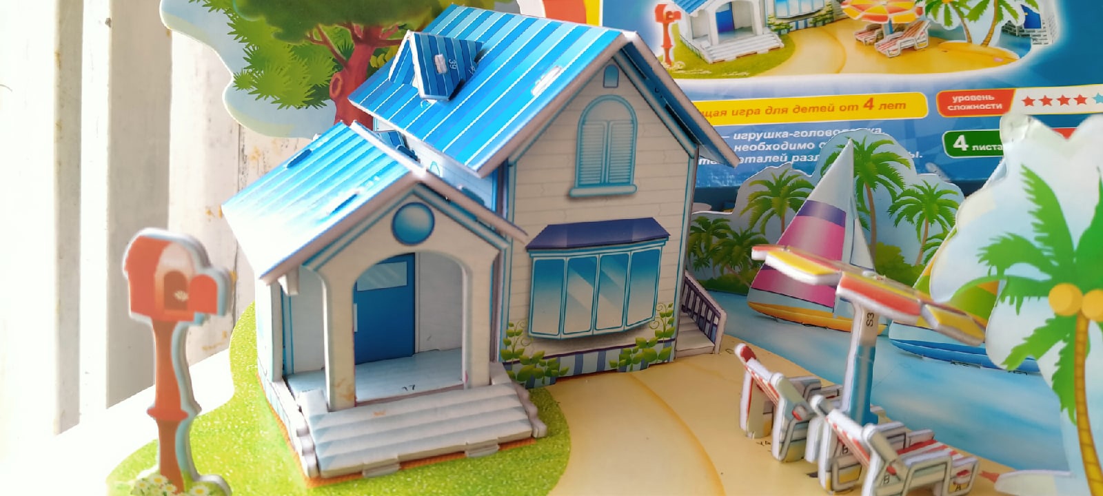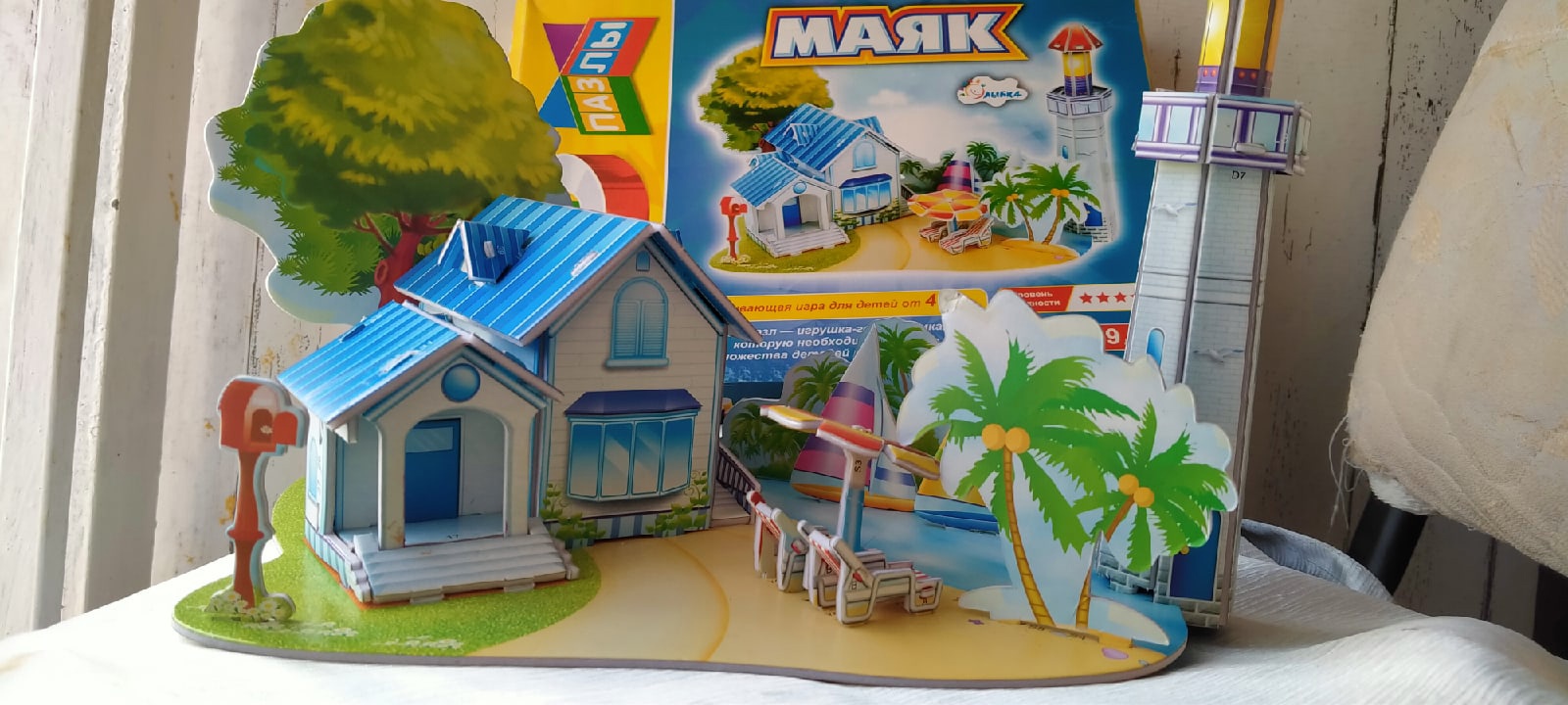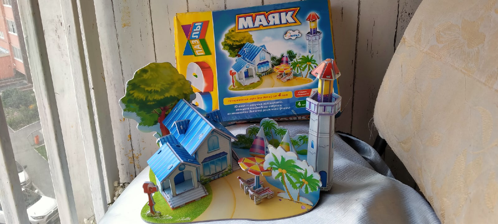 Собирали всей семьей. Дети собирали лежаки, зонтик и устанавливали на основание готовые детали. А взрослые уже собирали домик и помогали в сборке маяка. Оказалось сложнее, чем мы думали. Но было очень интересно! Клей и ножницы в этом наборе не нужны, все детали готовы к использованию, нужно только сгибать в нужных местах. Детальки сделаны из картона (с пропененным материалом внутри), толстенькие, объемные. На детальках написаны цифры, помогающие в сборке.
