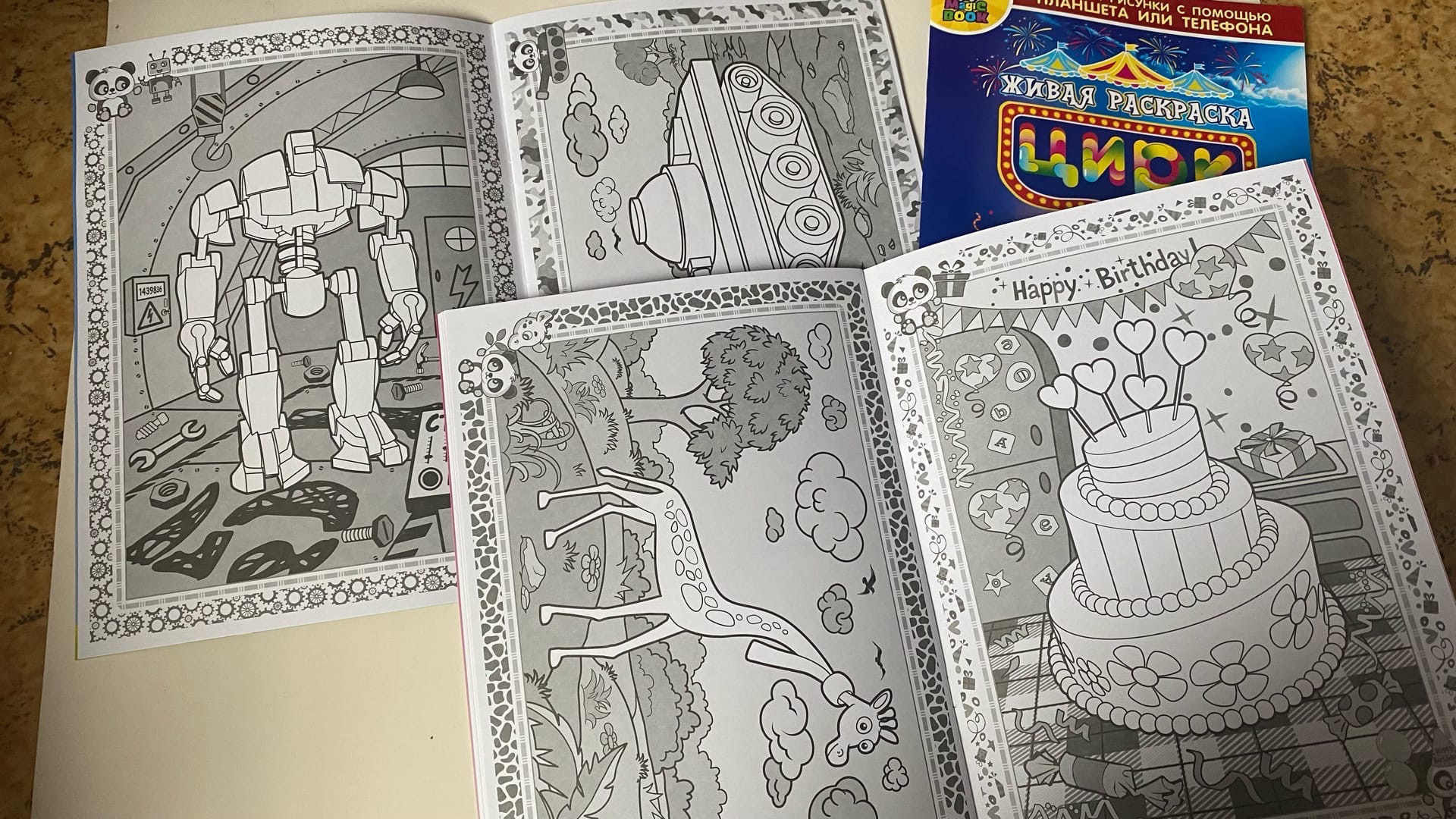 После раскрашивания через приложение можно оживить картинки. Смотреть через планшет дочка любит даже больше, поэтому торопится раскрасить сразу все. Раскрашивать нужно не всю страницу, а только белые части. Именно они будут использованы при "оживании" картинки. На планшете изображение оживает, и с ним можно взаимодействовать. В целом, не плохая задумка, но повторы расстроили.