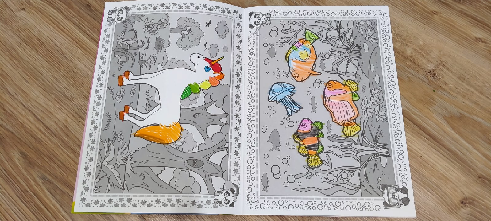 Может это правильно, но, например, у меня есть сканер, поэтому, чтобы раскрашивать картинки по-разному, я просто отсканировала листочки, чтобы раскрашивать именно их, а не оригинал раскраски. Так я делаю всегда. А тут зачем-то сделали книжку большую, но половина повторов. Сами картинки хорошие, интересные. Но универсальные картинки повторяются друг у друга, поэтому одному ребенку для разнообразия не стоит брать две раскраски.