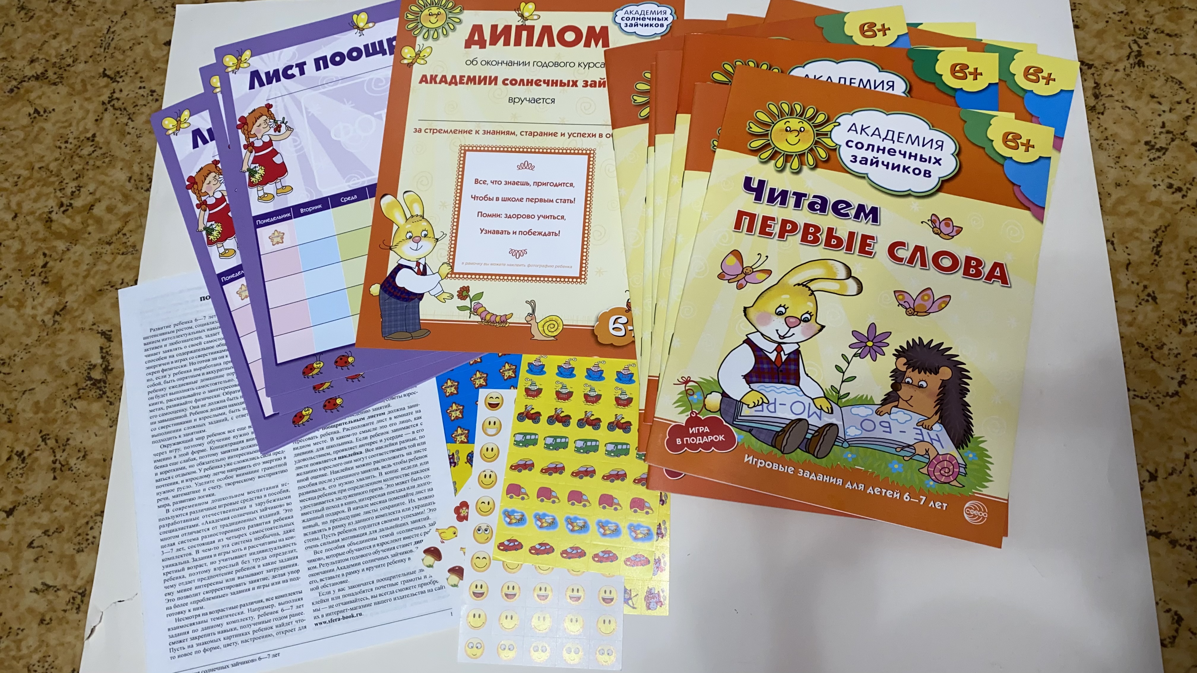 Комплект «Академия солнечных зайчиков» в подарочной коробке: 9 книг с занятиями для детей, игры, рекомендации для взрослых, рамка с дипломом, 12 листов поощрения, 500 наклеек для поощрения.