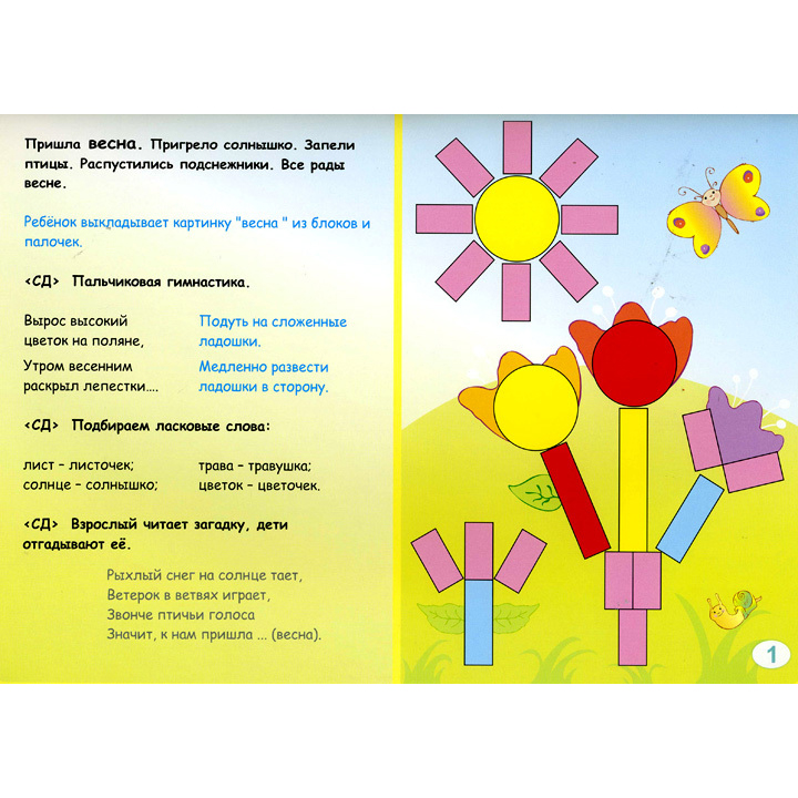 В альбоме 12 страниц заданий. Для печати использована глянцевая бумага, более стойкая к загрязнению и износу, чем матовая. Яркий альбом приятно взять в руки. Разворот представляет собой целый комплекс заданий, направленный на отработку определённой темы. Левая страница посвящена речевому развитию малыша, здесь есть стихи, комплексы пальчиковой гимнастики, задания на развитие речи, отгадывание загадок, упражнения на развитие речевого дыхания и голоса, а также подвижные игры. Правая страница посвящена заданиям по конструктивной деятельности, связанной с использованием блоков Дьенеша и палочек Кюизенера.