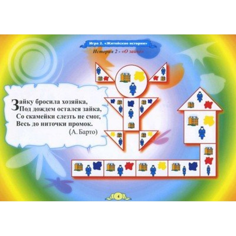 2. Игра «Житейские истории» включает две истории о коте и зайке – героях из известных произведений А.Барто. Дети осваивают метод декодирования (процесс восстановления информации представленной в закодированном виде). Благодаря полученной таким образом информации малыши отремонтирую машину и довезут зайку до дома, который построят для него.