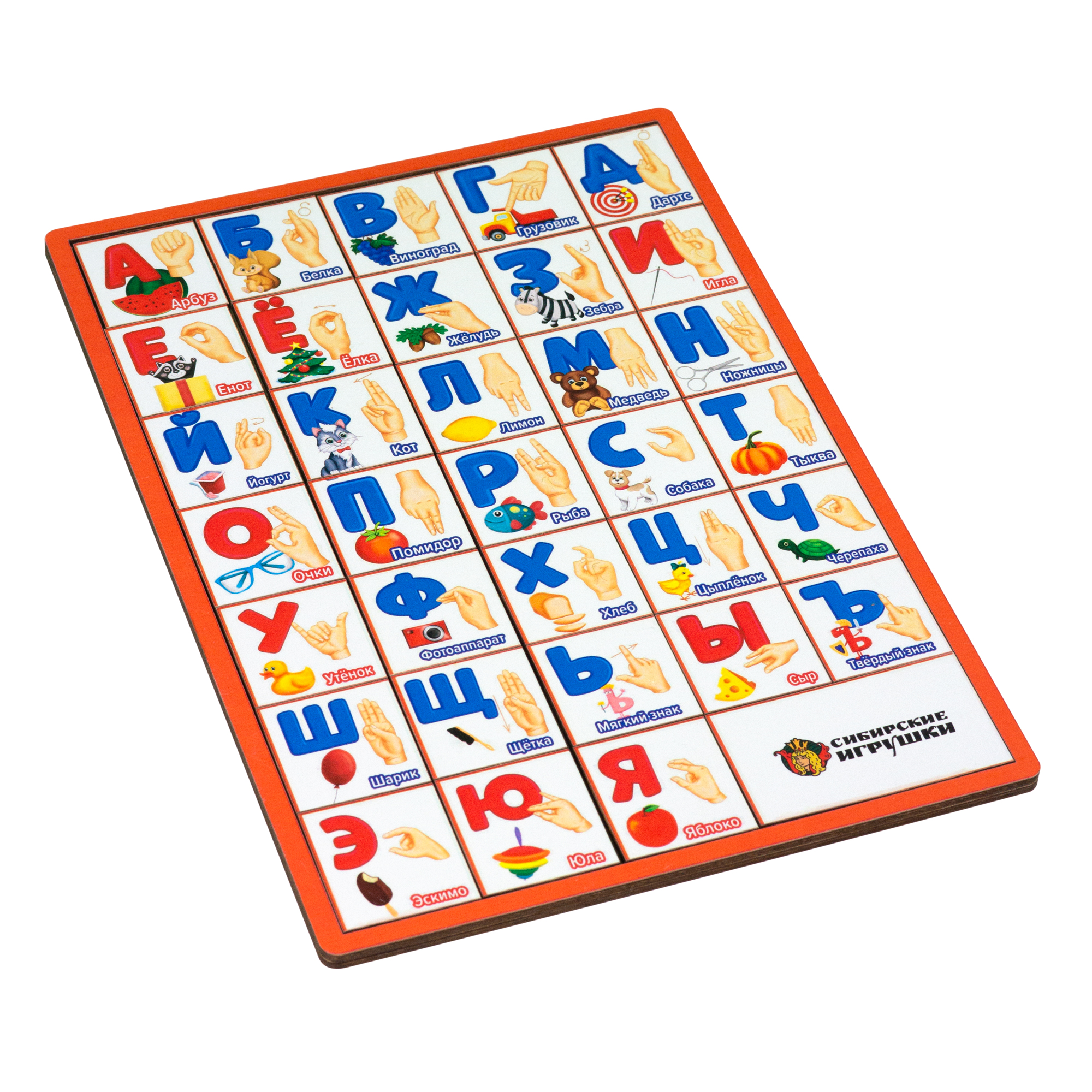 Русский алфавит. Под каждой буквой находится картинка, название которой начинается с данной буквы, а так же жест, который обозначает эту букву.