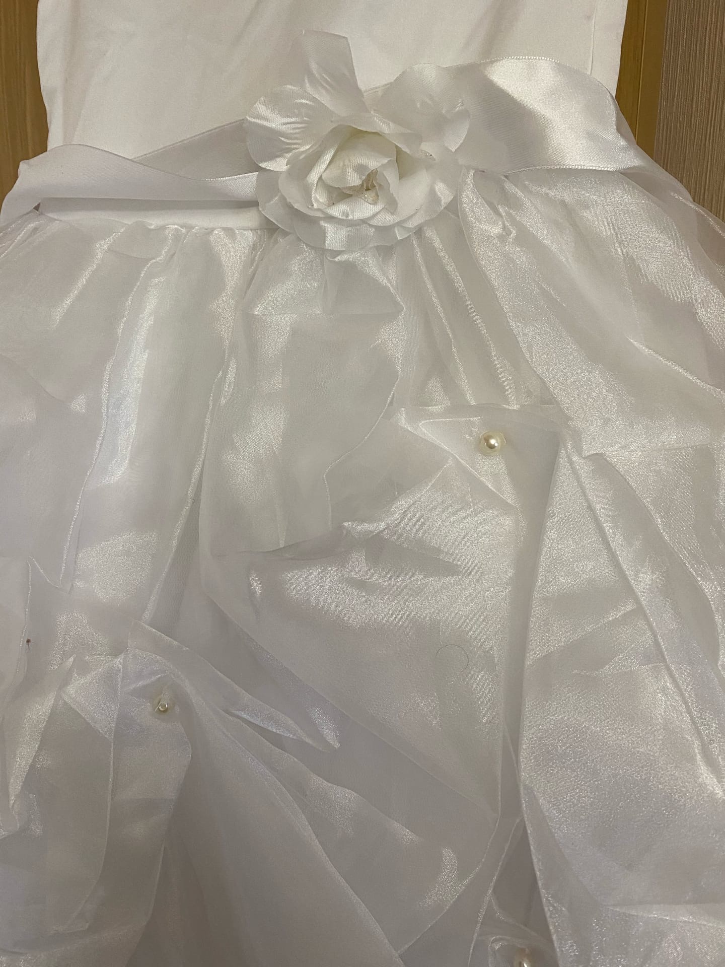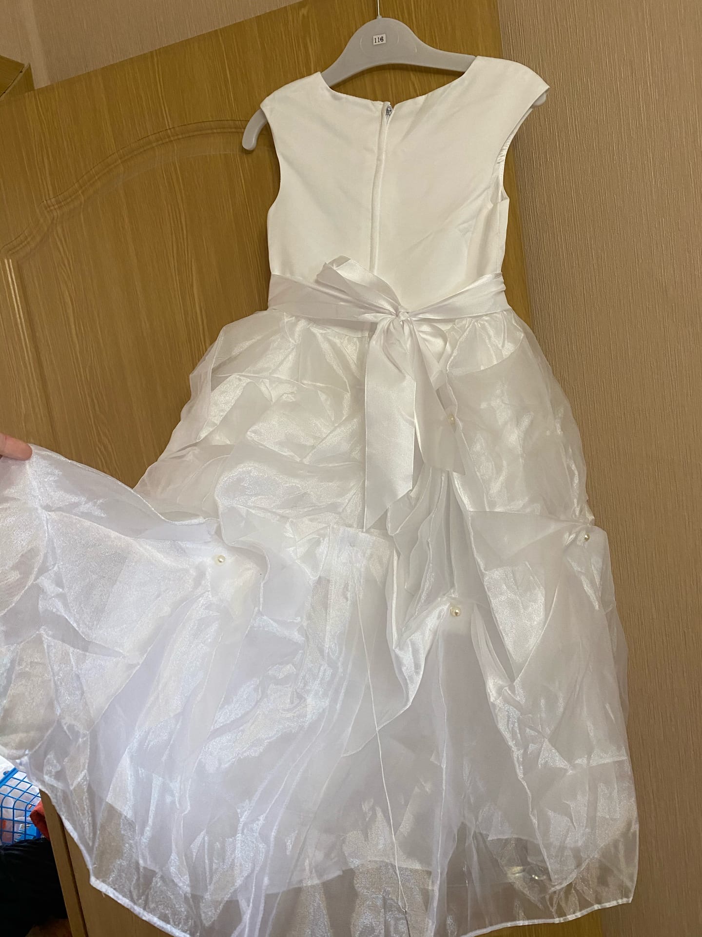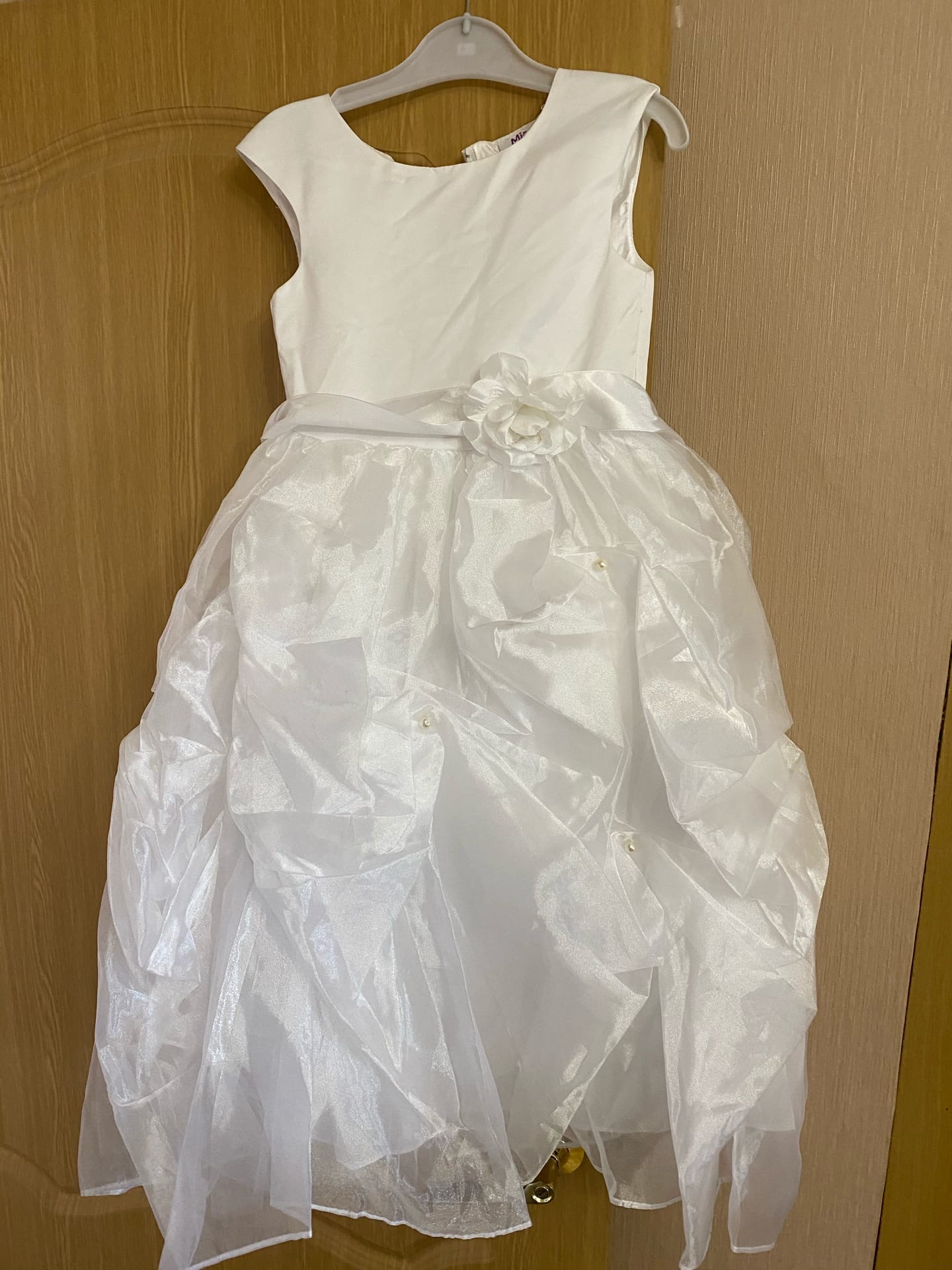 Понравится каждой принцессе. Юбка многослойная, внутри есть сетка для придания пышности. Каждый слой надо прогладить, чтобы юбка стала пышной. К этому платью не обязательно одевать украшения, чтобы не перегружать образ ребенка. Достаточно сделать аккуратную прическу и украсить белыми цветочками. Такие купить не трудно. Хранить лучше в шкафу, чтобы меньше мялось.