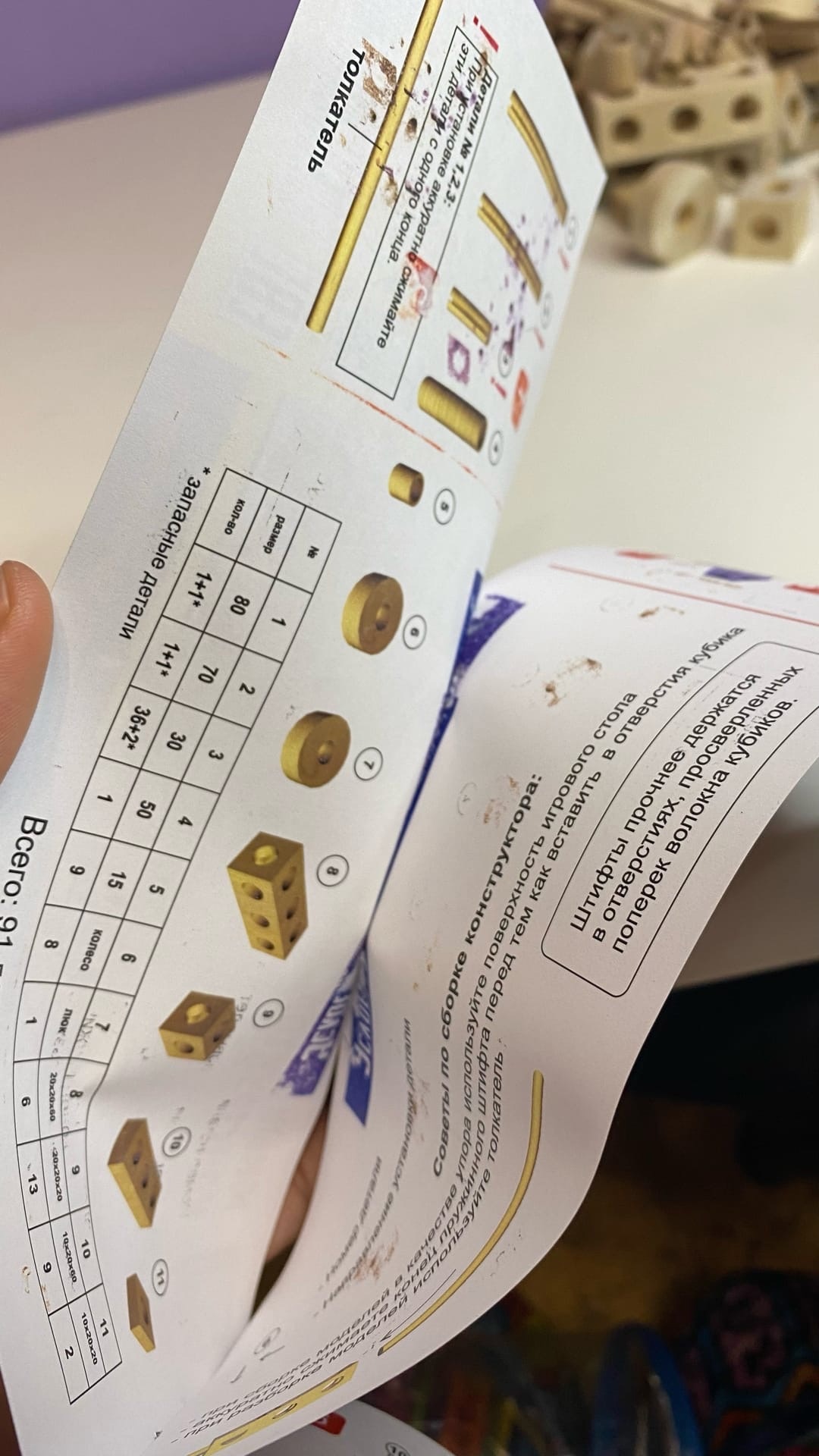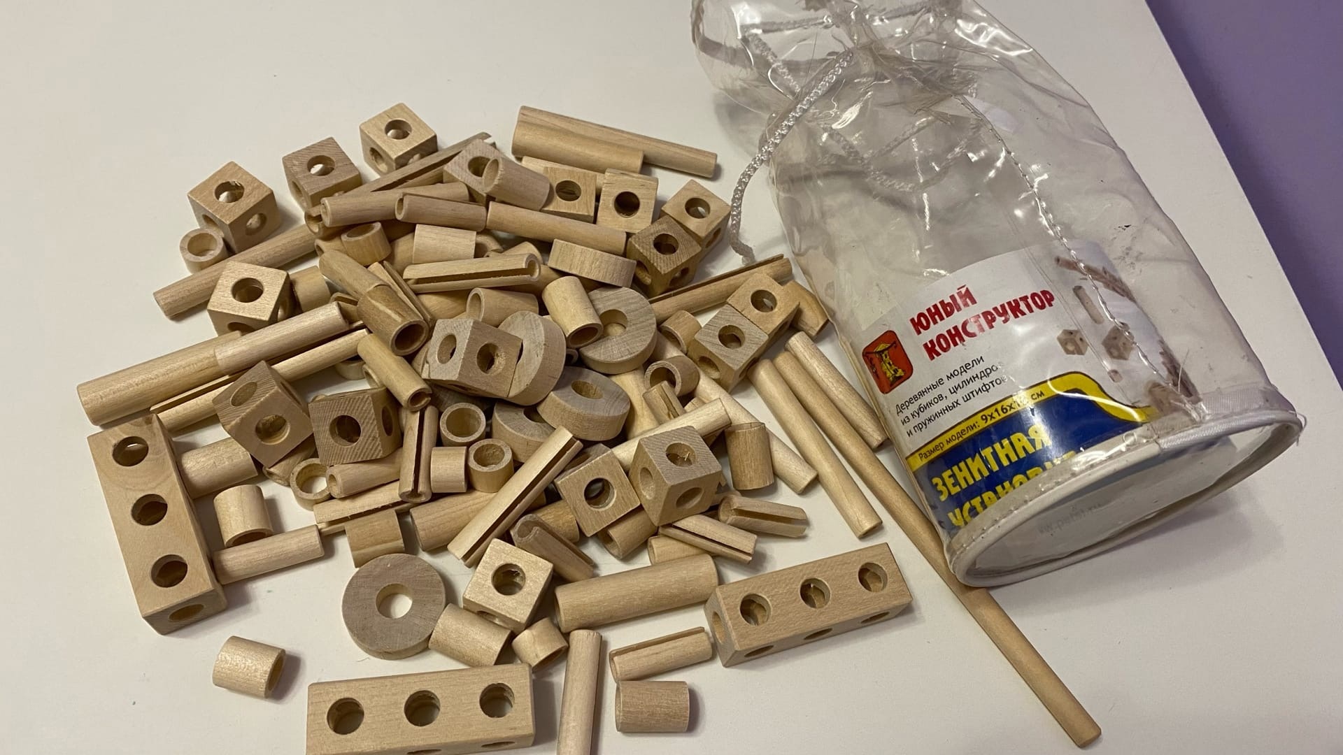 И прежде чем подарить, было очень любопытно самой в него поиграть, и попробовать собрать танк, чтобы понять, годится такой набор ему для подарка, или ещё рано и он не сможет собрать его сам. Конструктор продается в прозрачной крепкой сумочке. В ней видны все деревянные детали и инструкция. Правда инструкция немного залипла внутри, краска прикипела.