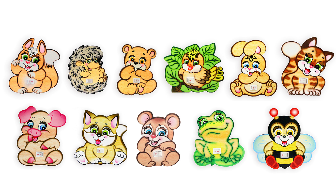 В серию «Ночники» входит два десятка забавных зверюшек, которые принесут радость и покой девочкам и мальчикам в вечернее и ночное время суток. Вы сможете выбрать именно того зверька, который больше всего придётся вам по душе. Это может быть яркий «Львёнок Лёвушка» (13,4 х 14,5 см), весёлый «Лягушонок Жора» (12,5 х 13,5 см), застенчивая «Мышка Норушка» (12 х 10 см), лопоухий слонёнок «Семён» (13,9 х 13,8 см), забавный «Зайчонок Игруня» (15,6 х 13,3 см), верный друг «Собачка Бом» (14,9 х 14 см), «Мишутка Медолюб» (15,2 х 12,4 см), «Ёжик Егорка» (14,8 х 12,1 см), пушистый «Бельчонок Шустрик» размером 15,9 х 13,7 см., а также маленький «Воробьишка Тишка» (12,9 х 15,6 см) и «Божья коровка Алька» (16,7 х 15,2 см).