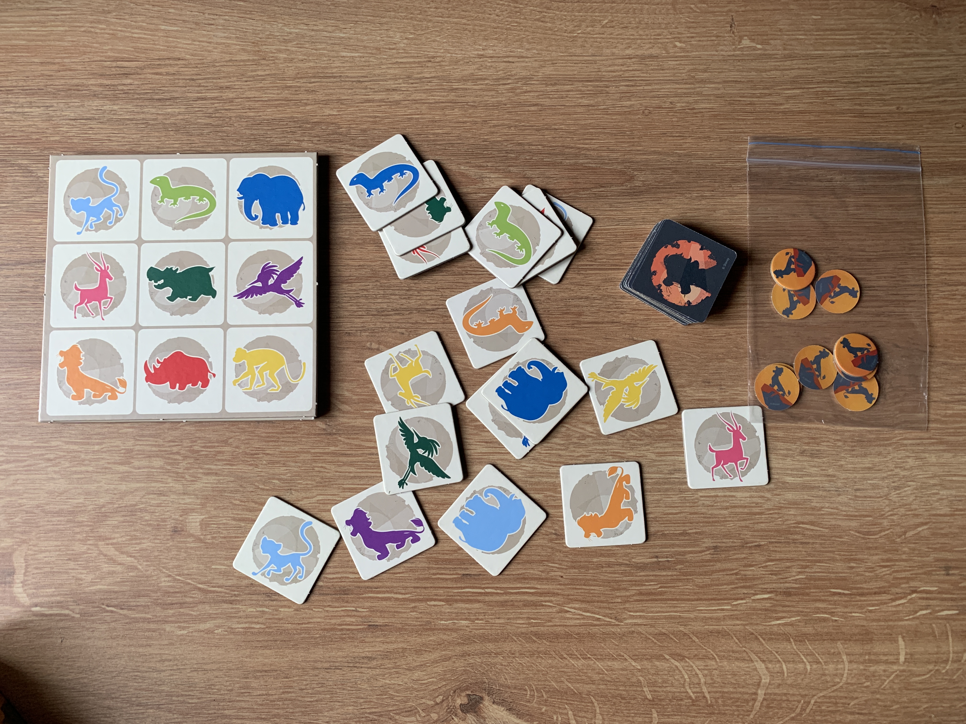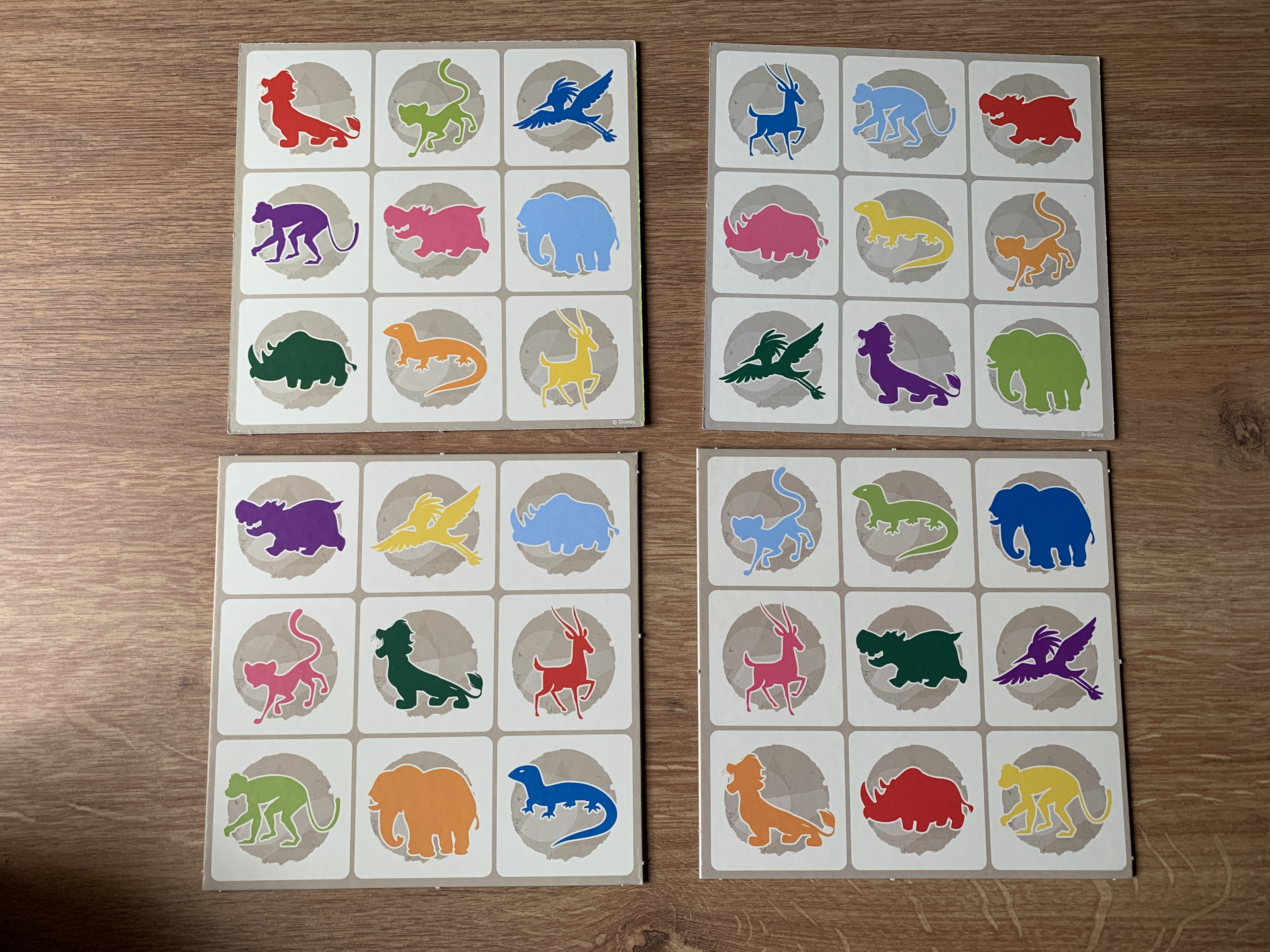 В комплекте вы найдёте 4 игровых планшета большого размера, оформленные с двух сторон рисунками животных, разлинованные листы на 9 клеток, в каждой из которых располагается маленькая картинка представителя фауны (36 шт.), которые следует извлечь из основы, 9 жетонов победителя с изображением льва, а также цветной буклет с подробным описанием игровых правил и пакетик для хранения карточек.