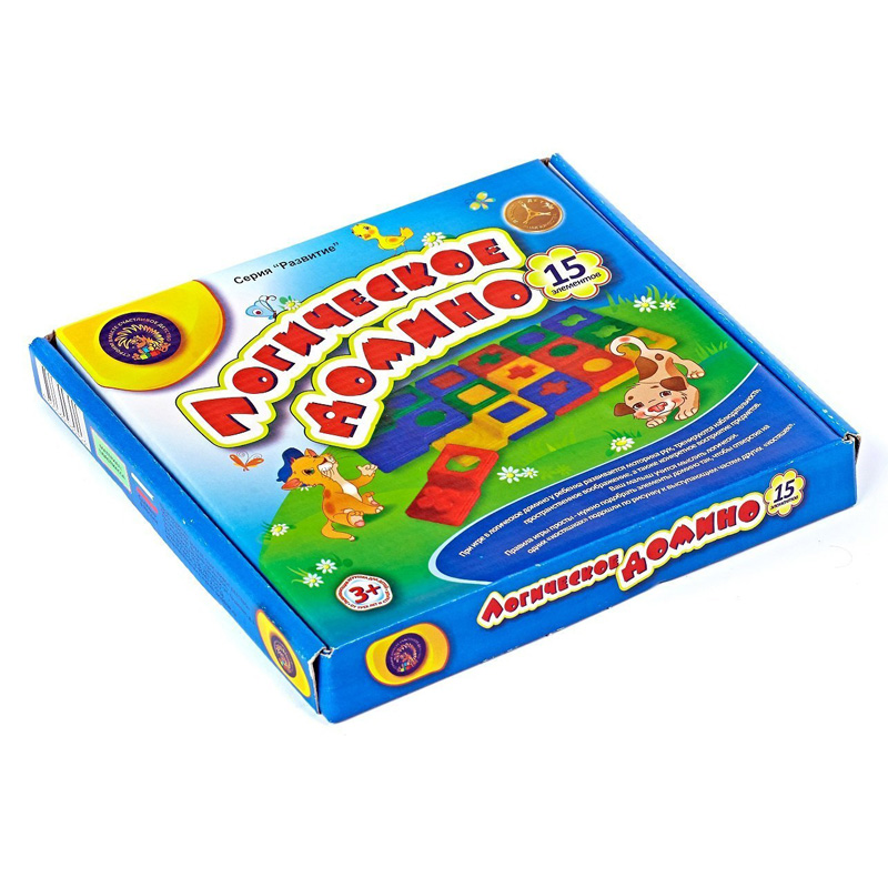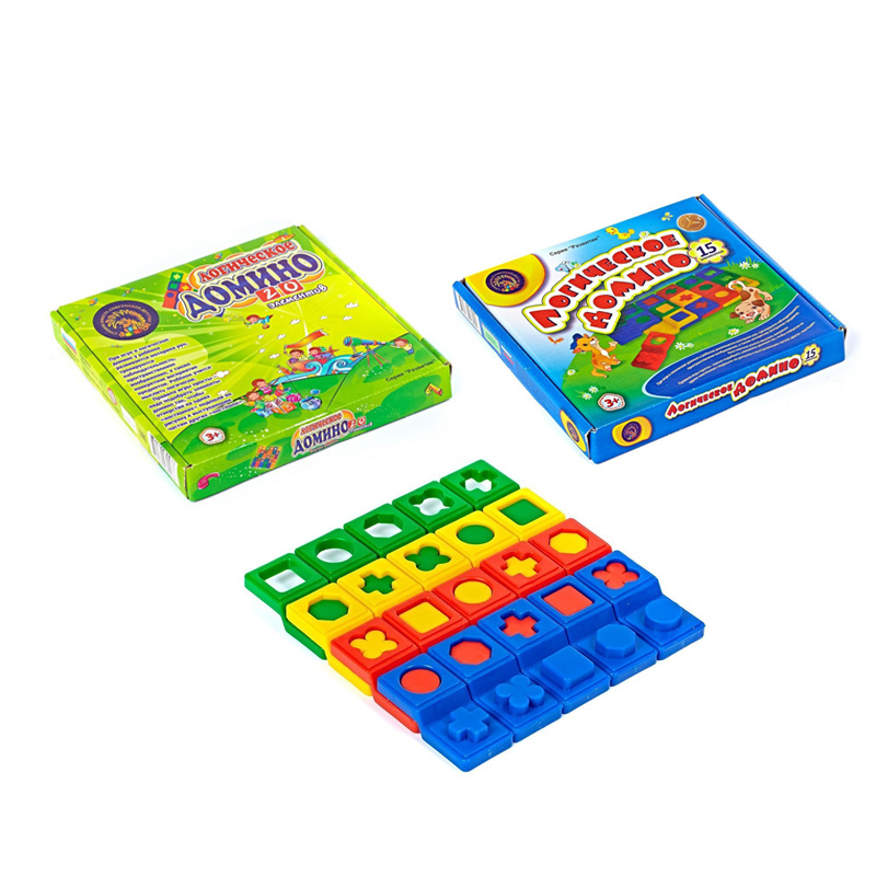 Домино «Логическое» российской ТМ «СВСД» направлено на изучение детьми от трёх лет и старше различных фигур, в том числе геометрических. В комплект входят элементы в виде пластмассовых «костяшек» красного, жёлтого, синего и зелёного цвета (количество деталей зависит от комплекта: 15 или 20 шт.). Каждая «костяшка» имеет две стороны: верхнюю со сквозным отверстие в виде определенной геометрической фигуры, нижнюю – в форме выступающего рисунка. Обе стороны игровой панели не могут быть идентичными, что усложняет задачу для ребёнка при подборе подходящей «костяшки». Все детали упакованы в прочную картонную коробку.