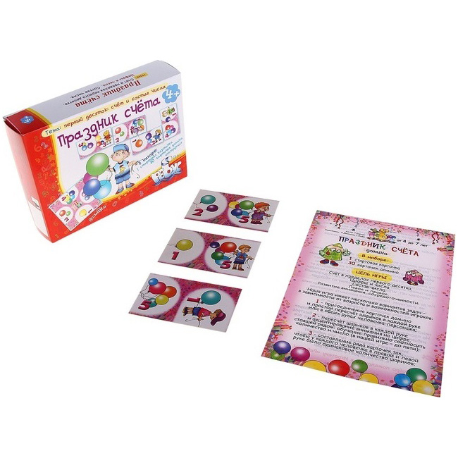 Российский производитель АНО ЦОТР «Ребус» предлагает родителям и педагогам обучающую игру «Праздник счёта» из игротеки Татьяны Барчан. Темой игры является счет от 1-го до 10-и и состав чисел в пределах первого десятка. Игра рассчитана от 2-х до 6-и игроков. В неё интересно будет играть как девочкам, так и мальчикам в возрасте от четырёх лет и старше(4+).