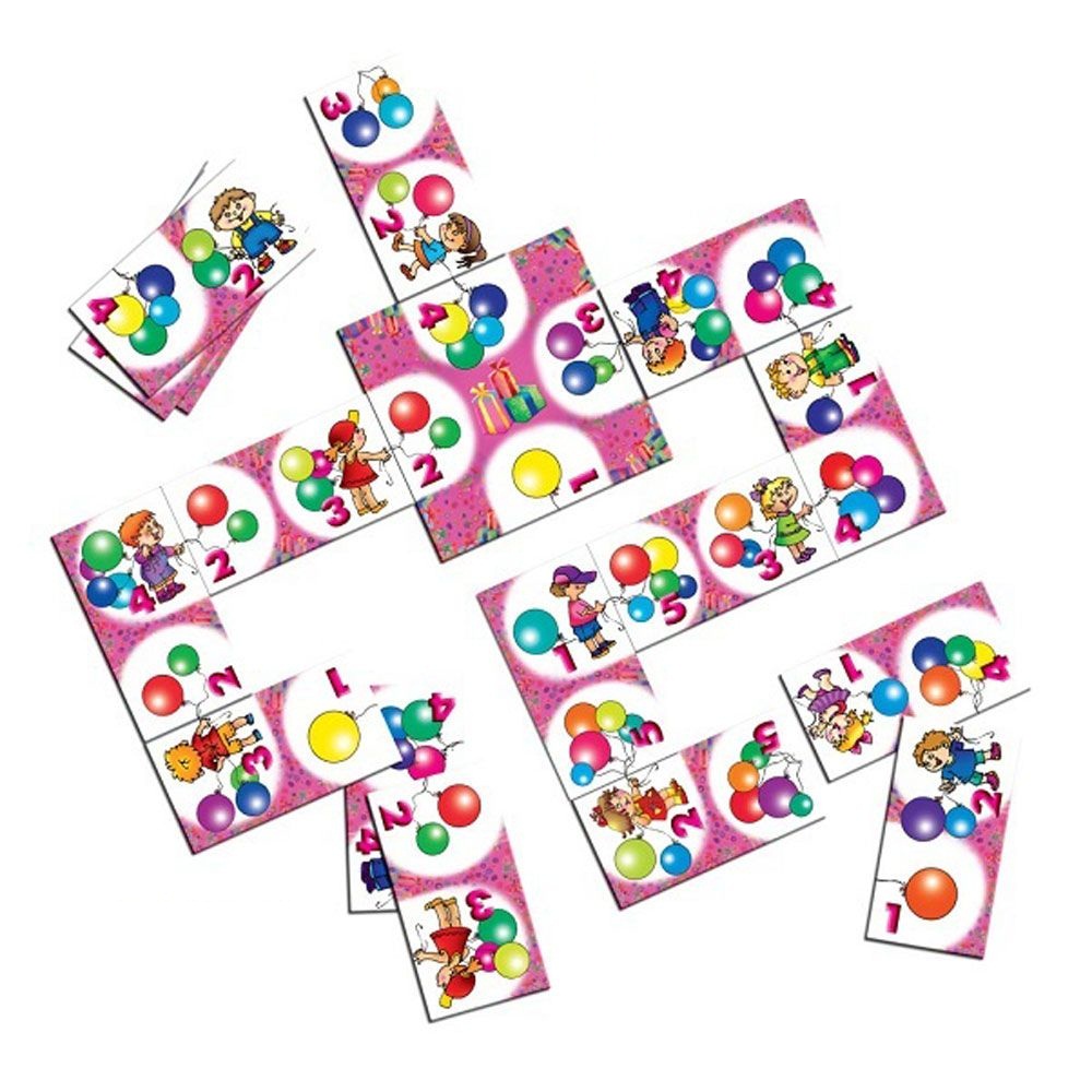 Упаковано игровое лото в красочную коробку из плотного картона размером 13,5 х 17,5 х 4 см. и весом 155 гр. Комплект состоит из: стартовой карточки размером 10,5 х 10,5 см, карточек-домино (32 шт.) размером 10 х 5 см, подробной инструкции. На стартовой карточке изображены по центру подарки в ярких упаковках, а по сторонам разноцветные шарики в количестве 1, 2, 3, 4. Карточки-домино зрительно делятся на две части. С одной стороны нарисованы мальчик или девочка с разным количеством шариков, а с другой стороны – разноцветные шарики от 1-10 шт. Все карточки изготовлены из плотного многослойного картона, рисунки нанесены нетоксичными красками.
