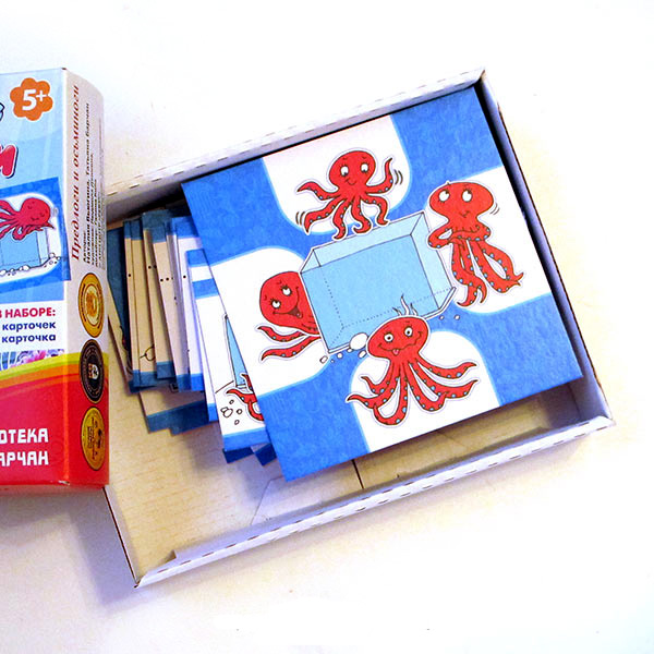 Весёлые осьминожки помогут малышам разобраться в сложных вопросах. За деревом, на полянке, под крышей, в коробке, и у дороги встречаются предлоги. Осьминожки наглядно покажут какой именно предлог необходимо поставить в том или ином предложении. В наборе 40 игровых карточек с изображениями осьминогов и схемами предлогов (20 красного цвета и 20 синего), стартовая карточка и подробная иллюстрированная инструкция. Игра рассчитана на детей от 5-ти лет, подходит как для индивидуальных, так и групповых занятий (количество игроков от 1 до 4).