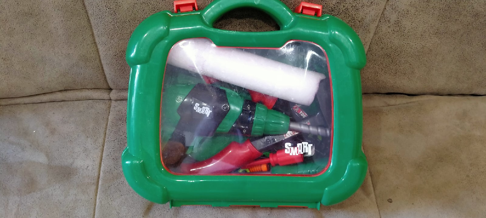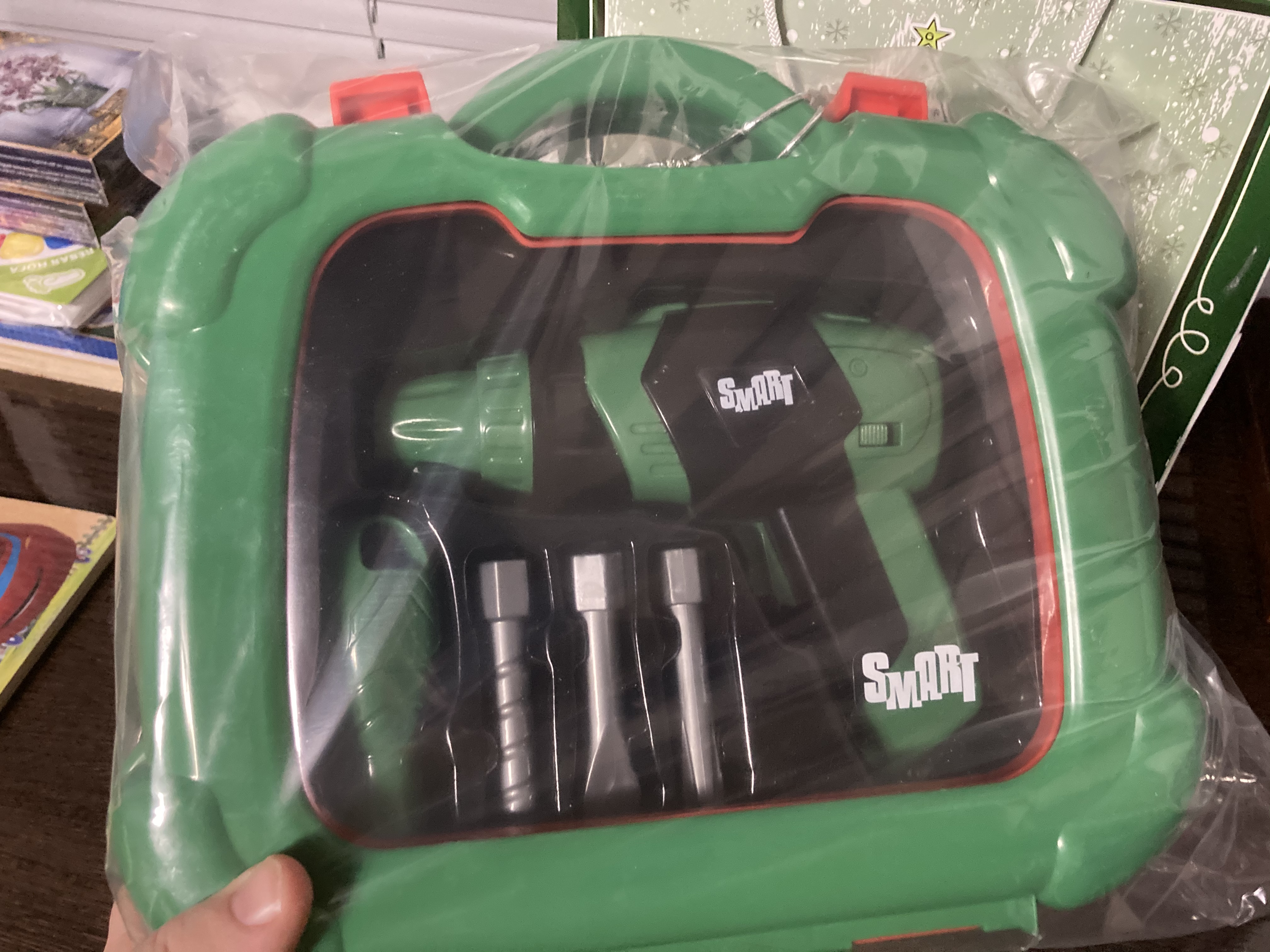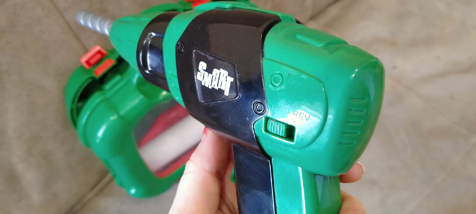 Мой сын все повторяет за отцом и давно просил себе свою собственную электрическую дрель. Вот и решили ему купить эту игрушку. Но, к сожалению, сын игрушку не оценил, так как эта дрель по-настоящему ничего не крутит и не ремонтирует. Видимо, он перерос уже эту игрушку, его имитация дрели уже не устраивает. Но через несколько дней сын все-таки стал играть этой дрелью, воображая, что он ремонтирует все вокруг. Но все равно расстраивался, что это все не по-настоящему. А теперь подробнее о самой дрели.