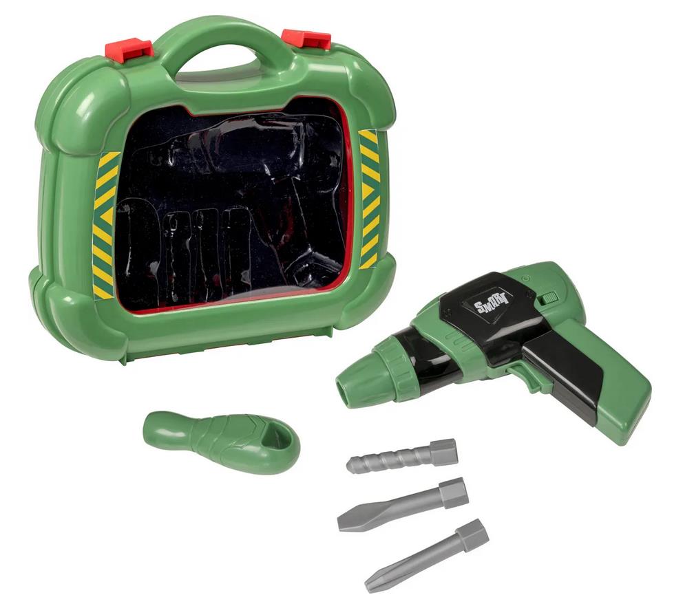 В наборе к дрели есть несколько насадок, можно их менять. Дрель работает на батарейках. При нажатии на кнопку начинает крутиться сверло. Но при этом, если задеть сверло рукой, оно начинает стоять на месте (ребенок не поранится, но и ничего не сможет закрутить этой дрелью, даже игрушечные болтики). Есть переключатель (прям как у настоящей дрели!), с помощью его дрель начинает крутить в другую сторону.