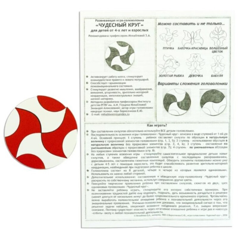 Уникальная авторская игрушка-головоломка «Чудесный круг» Вячеслава Воскобовича* непременно увлечёт не только детей, но и взрослых. Несмотря на внешнюю простоту, здесь содержится несколько уровней сложности и множество вариантов сборки. Игра-головоломка предназначена для детей от 4-х лет. К игрушке прилагается подробная иллюстрированная схема с заданиями и вариантами сложения различных фигур из прилагаемых деталей. Диаметр круга 11 см. Благодаря своим миниатюрным размерам и невесомости (набор весит всего 56 г), головоломку удобно хранить и при необходимости можно взять с собой и позаниматься на свежем воздухе. Необычная игрушка представляет собой круг, который состоит из 8 элементов. Из этих составных частей ребёнок должен собрать как можно больше различных силуэтов: животных, цветов, бабочек, фигурки человечков, можно придумать фигурки и самостоятельно.