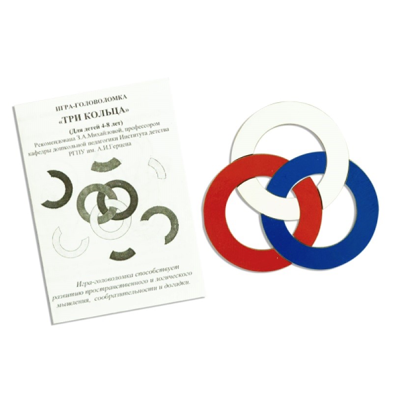 Как и большинство игр Вячеслава Вокобовича, головоломка «Три кольца» рекомендована педагогами высших учебных заведений, психологами. Эти игрушки используются не только в детских дошкольных образовательных учреждения, последнее время широко применяются и дома, в качестве развивающих занятий. Игра предназначена для детей от 4 до 8 лет. Что же представляет собой данная головоломка? Три тоненьких колечка разных цветов, переплетены друг с другом. Каждое колечко состоит из двух неравных частей. Ребёнку нужно собрать все составные части в одно целое, можно воспользоваться предложенными вариантами, которые содержатся в небольшой иллюстрированной инструкции или придумать свои методы.