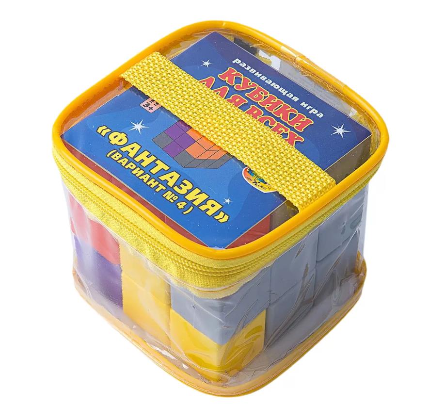 Развивающая игра «Фантазия» – вариант №4 для малышей от трёх лет и старше (3+). Набор входит в серию «Кубики для всех», в которую помимо вышеуказанной игры вошли комплекты с фигурами разной конфигурации, а также подарочный набор, составленный из всех пяти мини комплектов. Производителем увлекательных наборов является известный российский производитель ООО «Корвет».