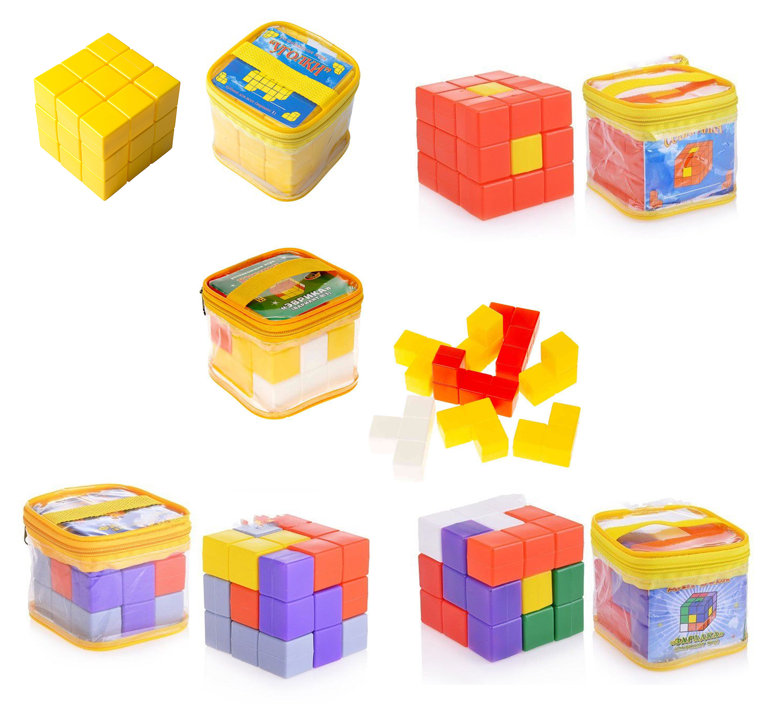 «Эврика» – это вариант № 3, предназначенный для малышей от трёх лет и старше (3+). Игра состоит из 27-и кубиков, соединённых между собой определённым способом. В результате мы имеем одну фигуру белого цвета похожую на букву «Т», два оранжевых элемента в виде буквы «Г» и пять жёлтых уголков. Из представленных деталей дети смогут составить модель, как в плоскости, так и в объёме.